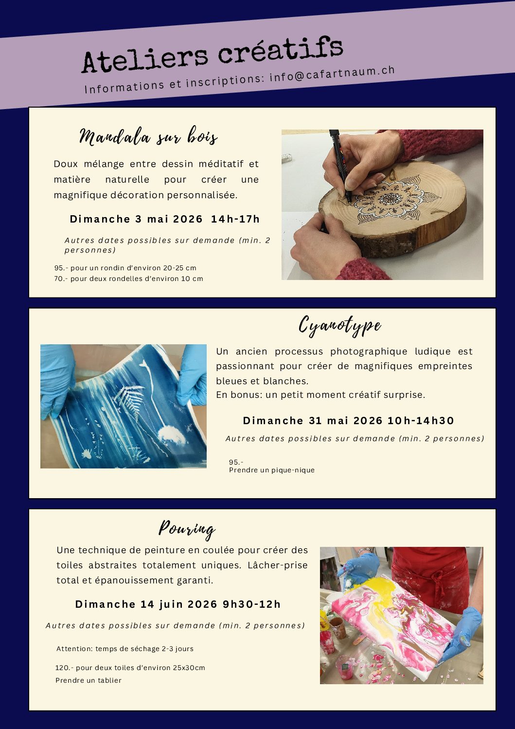 Des ateliers pour petits en grands, pour réveiller l’artiste qui someille en vous, pour développer vos talents en suivant un cours ou simplement pour le plaisir de créer